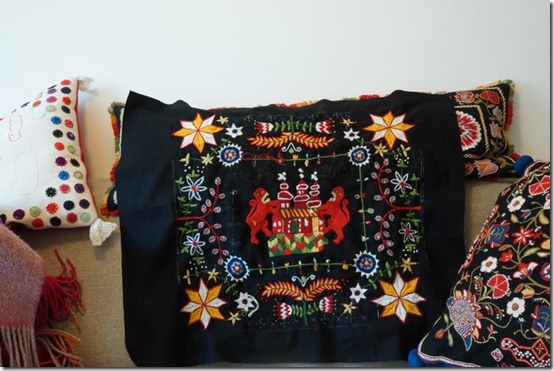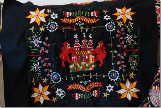 Nu har det verkligen hänt grejer på Lejonborgen. Bussresans många och långa timmar med broderi har gjort att yllerbroderiet snart är färdigt. Om man jämför de två översta bilderna så kan man se effekten av den inre inramningen runt lejonborgen har. Det är alltid roligt när ramen kommer på plats eftersom det gör så mycket för helhetsintrycket. Nu är det bara lite kvar att brodera på den inre ramen, hela den yttre ramen och så initialer och årtal. Sen är den faktiskt klar. Galet ju!