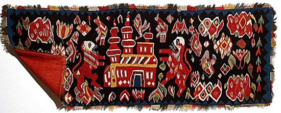 Lejonborgen. Slott flankerat av två lejon. På var sida träd med fåglar och blommor. Baksida med röd vadmal. Kavelfrans 2 cm. Förvärv till museet: 1883. Foto och källa: Kulturen